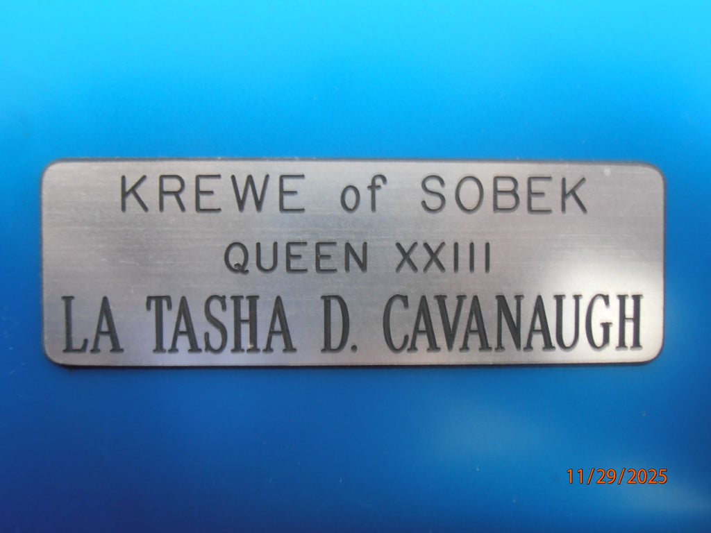 Our custom NAME PLATES are available in gold or silver. They measure 1 inch in height and 3 inches in width. They come with a "self-adhesive" peel off tab on the back for easy placement on your crown case or another item you wish to personalize. 3 lines of inscription are available. If you don't need that many just put NA in the other lines. If you are planning to put the nameplate on a crown, we suggest you use "hot-glue" after bending the nameplate to apply to the crown's curve.
