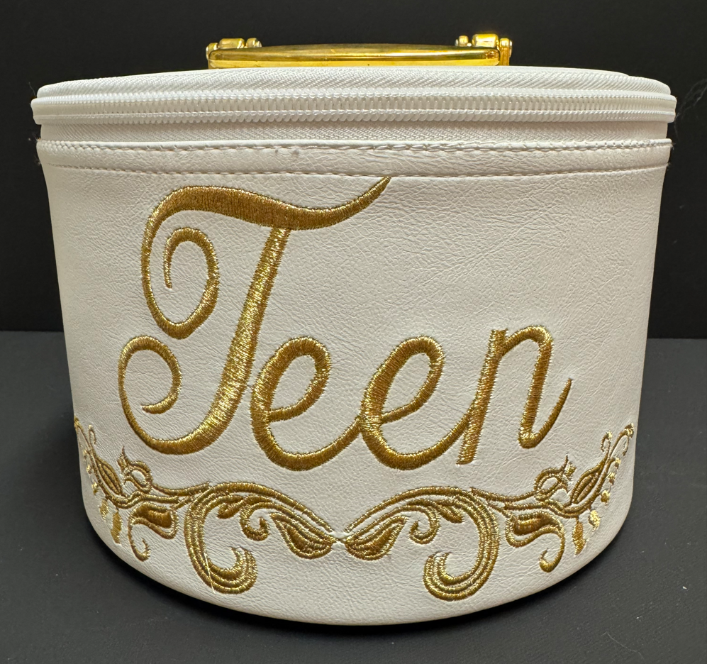 This sophisticated white faux leather crown case is adorned with intricate gold embroidery, designed for a refined Queen. Measuring 8" wide and 5.5" tall, its smooth, rounded shape showcases a beautifully embroidered crown on both the front and top. A reliable zipper closure keeps your crown secure and well-protected.